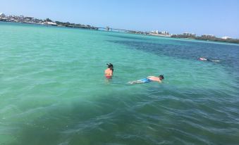 Our beach access is across the street and quieter and more private. It's one of the most desirable on the Siesta Key but has no parking available and isn't easy to access from rentals outside the neighborhood. The water here is shallow clear and calm with white quartz-sand tide-pools perfect for sleeping drinking or playing. A livelier beach scene with food, drinks and even a weekend drum circle is accessible a 5-to-10-minute walk south on the beach.