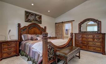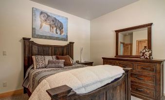 The master suite is furnished with a King-sized bed and private bathroom. Relax in the jetted tub or warm up in the separate tile shower.