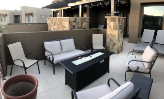 - A Balcony with Outdoor Seating, Lounge Chairs, and Festoon Lighting