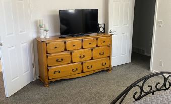 The bedroom has one king size bed, dresser, 2 nightstands, a fan and luggage rack in the closet. There is also a TV with streaming apps. We offer additional beds in the form of air mattresses (twin or queen) and a pack-n-play available upon request that can be set up in either the bedroom or living room.