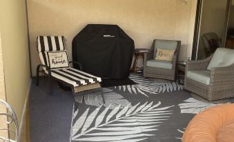 There is a patio space for the unit with chairs, a BBQ grill, and hot tub.