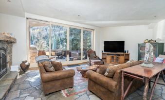 The entrance of Rivercrown 7 leads into a spacious FOYER that allows easy access into the covered GARAGE parking area. The dazzling GREAT ROOM is wide open and filled with natural light, and features a luxurious LIVING AREA with a crackling stone fireplace, multiple leather sofas, and a large HDTV. Glass doors lead outside to the private TERRACE, which features a gas grill, outdoor dining area, and a hot tub that overlooks serene Beaver Pond and stunning Ajax Peak.