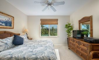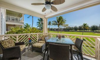 Located on the beautiful Waikoloa Beach Course, 1st fairway and green with the Petroglyph Trail and Mauna Kea as the backdrop, the second floor unit has two bedrooms with king size beds and options for separate twin beds, an open lanai and generous living space for your vacation pleasure. The high ceilings and doorways give an extra spacious feel. A fully equipped kitchen and laundry machines in the condo make it feel like home. A reserved parking space in shaded carport is right in front of the building. The infinity pool, jacuzzi and BBQ area make for great day and evening outdoor fun.