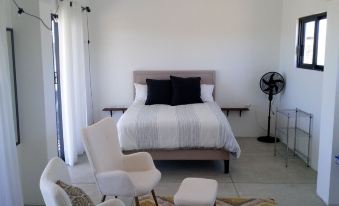 With plenty of free parking on our large lot, Casa de Noanie is only minutes from the beach and downtown Todos Santos. This studio-style home with a queen sized bed, one full bathroom, outdoor patio, and a full kitchen that is well-stocked for cooking, is a comfy getaway for two guests.