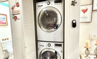 Both bedrooms offer restful comfort with plush bedding, private bathrooms, and ample closet space. A convenient half-bath adds extra ease.