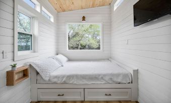 Escape to The Hideaway, cabin tucked away on the hillside just 30 minutes outside Waco, Texas. This tiny home offers a fully appointed interior living space as well as a soft-sided hot tub (year round), deck, and fire pit for enjoying the natural beauty of hillside views and night stars. The Hideaway offers seclusion while still being close to the cute Texas town of Valley Mills, offering the best of both worlds.