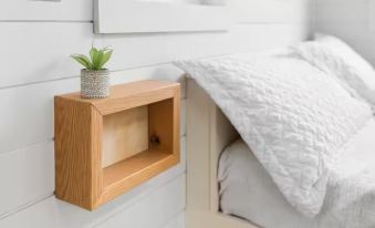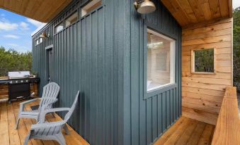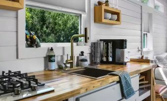 * Kitchenette: The tiny home features a convenient kitchenette with a stocked Keurig, 2 burner propane stovetop, toaster oven, mini fridge, essential dishes, flatware, and salt, pepper, and sugar.