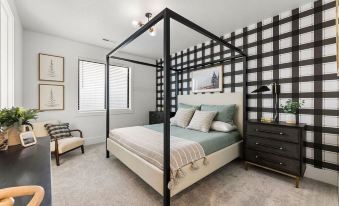 Escape to the sanctuary of your private, primary suite located near the back of the home. The room includes natural materials, metals accents and a luxurious king size canopy bed highlighted by a cozy, farmhouse accent wall. Suite also includes a private bathroom with double vanity and tiled walk-in shower, as well as, an enormous walk-in closet for extra storage.