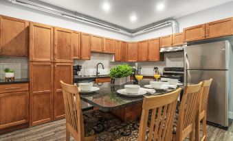 Prepare delicious meals in the well-appointed kitchen, located towards the back of the suite. Discover all the amenities you need to create a fantastic family dinner. There's a small table that comfortably seats two, as well as a large island with seating for four, providing enough space for dining and gathering.