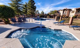 This was an excellent location and super lovely accommodations. We were 2 couples in Sedona for biking vacation and we had so many good trail access finishing back to the place on our bikes! The place was perfect with two bathrooms off of the two main rooms and 3 sliding patio doors to access the sunny garden space for morning coffee or afternoon beers after our ride! The pool and two hot tubs were great. The place is well stocked and host very responsive. I would come back to this place, with no hesitation. and