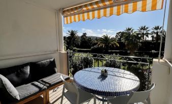Position géographique parfaite , petite terrasse plein soleil très jolie sur jardin et la mer au loin . Appartement simple et très efficace .