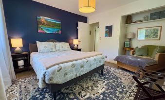 Enjoy rainforest ambiance from our spacious lanai, providing an outdoor dining area perfect for enjoying morning coffee and bird songs. Inside, the living room offers comfort with an electric fireplace and a 55" Roku smart TV. The loveseat conceals a twin-size pull-out memory foam bed, adding versatility to your stay.Stay connected with fast WiFi and enjoy complimentary coffee and tea.