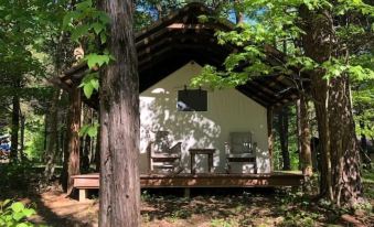 Named for our favorite Smooth Hound Smith song, "Young & Golden" is a 12'x14' safari tent on a wooden platform with a roof. Listen to tree frogs as you drift off to sleep on a queen bed with soft, dreamy linens. The tent features power, lamps, chairs, and a desk inside. Outside, enjoy a private fire pit or sit a spell on a rocking chair on the back deck. Our Community Shelter, with a fridge, sink, and coffee maker, and our Bath House with flush toilets and hot showers are a short walk away.