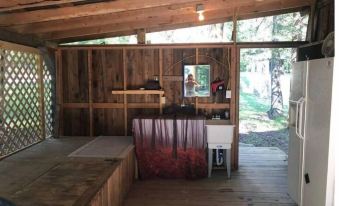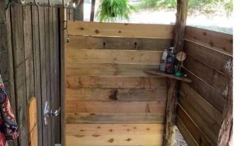 Young & Golden is secluded, yet close to amenities like the Community Shelter, which provides a a sink, mirror and outdoor shower, as well as useful cooking items: charcoal grill, refrigerator, electric burner, coffee maker, toaster, pots, pans and tongs. We also have a grate system that allows you to cook over the open fire (grates are hanging from a tree near the community fire pit).
