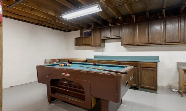 Basement has dart board, pool table, and foosball table.