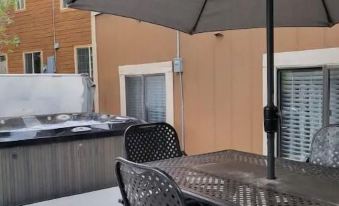 The backyard includes a flat top gas grill, patio table with an umbrella, and a 5-person hot tub.