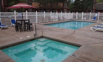 Relaxed setting with an outdoor pool and hot tub just steps away from your patio. Great spot for small families or couples alike. Wooded walking trail just across the street.