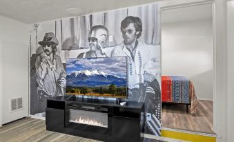 The living room is comfortable, with a sofa, club chair, floor lamps, and a fireplace console with a 55" Samsung Smart TV on top. The living room features an Easy Rider wall mural, paying homage to the iconic 1960s road trippers.