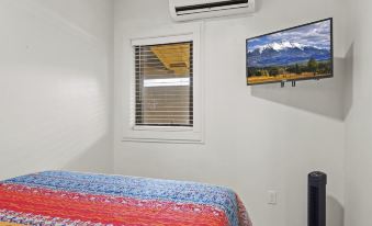 The single-level home features one bedroom with a queen bed and an ensuite full bathroom with a shower. It also has a spacious closet with hangers and a shelf, a headboard bench with reading lamps, and a Samsung Smart wall-mounted TV with speedy WiFi streaming access.