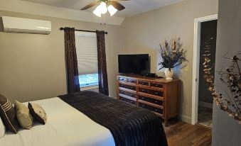 The first floor master suite contains a king bed, large dresser, Roku Smart-TV, closet and a private master bath.