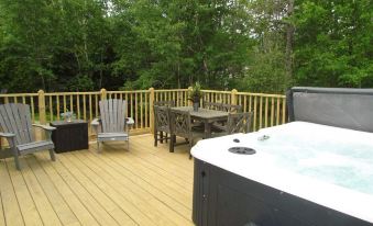 The 16 by 20 deck is located off of the main living space, complete with a 6-person hot tub, an outdoor door table for six, patio chairs, and access to the outdoor fire pit and charcoal grill.