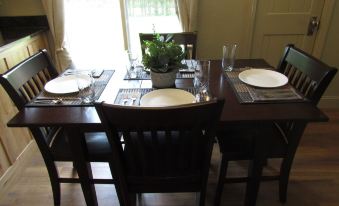 Graystone Cottage's fully stocked kitchen boasts rustic maple cabinets, granite countertops, and Samsung stainless steel appliances. Adjacent to the kitchen is a dining area, complete with a four-person dining room table. Extra seating is available along with TV tables for the kids!