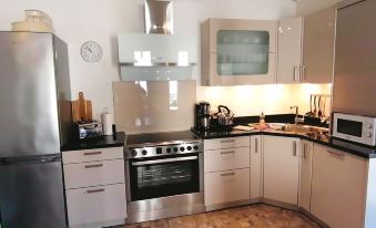 The large eat-in kitchen is the highlight of the holiday home. The 35m² communal room is furnished with a cream-white kitchenette with granite worktop, as well as an extra-large cooker with a 5-burner ceramic hob. A dishwasher, fridge, microwave, coffee maker, toaster and kettle complete the beautiful kitchen. Of course, there are also enough dishes, pots, pans, cutlery and glasses.