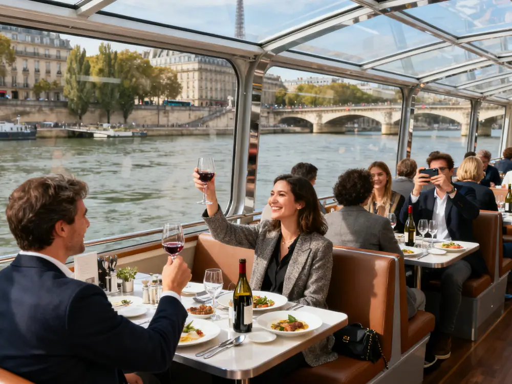 Seine River Champagne: Gently gliding along glittering waters, the Eiffel Tower's silhouette brightens in dusk light. Holding tulip-shaped glasses, watching stars rise from the flute's base, century-old architecture and complex champagne notes weave into a moving feast.