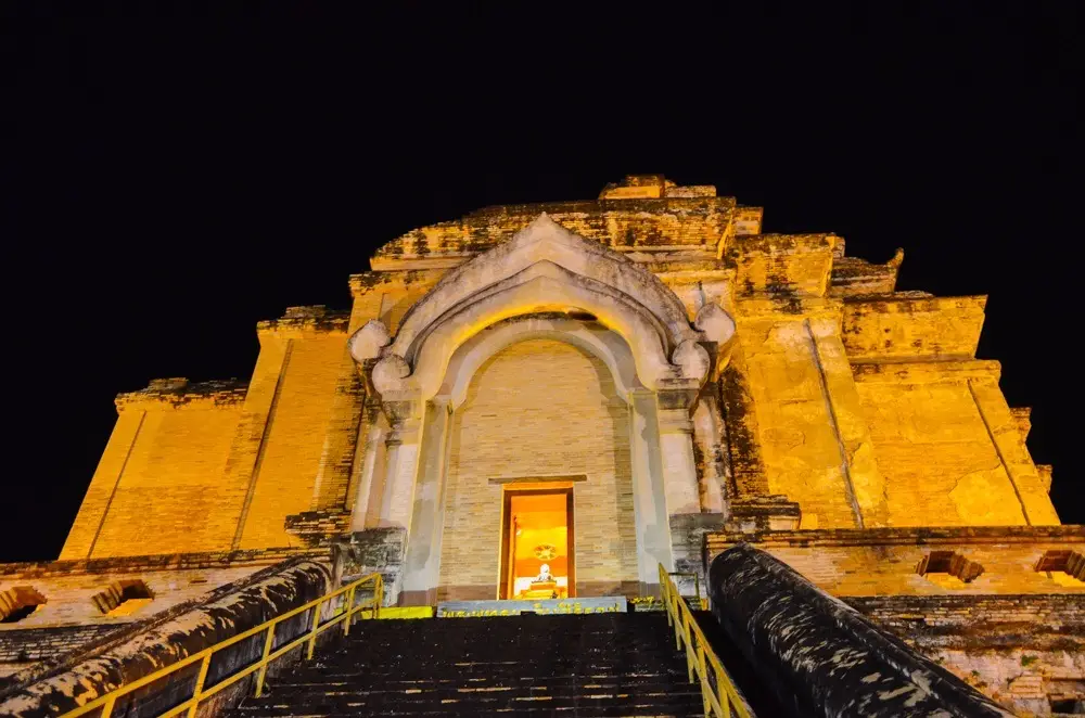 Night Temple Exploration: Wat Chedi Luang under moonlight reveals different grandeur, where illuminated ruins show time's texture. Wind chimes' clarity intertwines with night guards' sutras, creating soul-soothing harmonies.