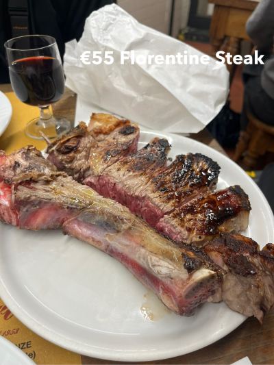 I went to Trattoria Mario, which is only open for lunch near my accommodation, as recommended in the guidebook. It is a small room, and you need to set up a table. There is no set menu, so I ordered the local specialty Bistecca alla Disossata, which is a grilled Florentine steak, boneless. In fact, everyone ordered T-bone steak, but a 21kg portion costs 35 euros, and I don’t have money. This one is only 12 euros, plus a glass of red wine, the bill is 14 euros! Very satisfied!