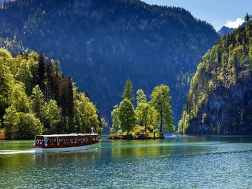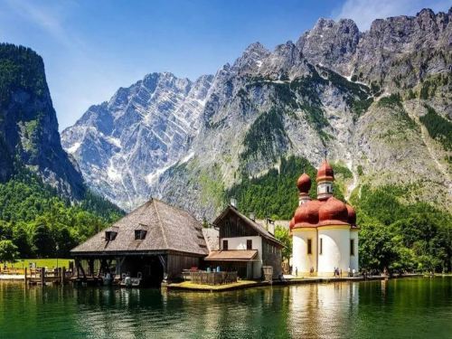 Explore the Konigssee in Munich, admire the emerald-like lake water and fjord-style cliffs, take a cruise to visit the red-roofed church, and enjoy the stunning Alpine scenery.