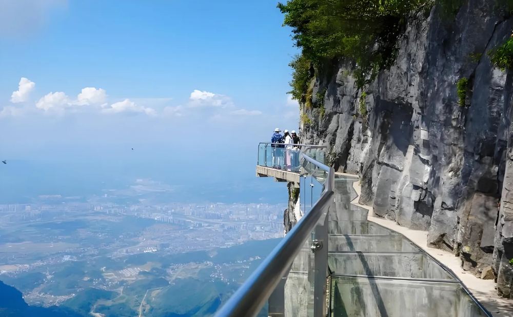 ▲ The Tianmen Mountain Glass Walkway is suspended on the western side of Tianmen Mountain's summit, measuring 60 meters in length and 1.6 meters in width. Constructed with three-layer laminated tempered glass, it can bear a weight of 1,000 kilograms per square meter.