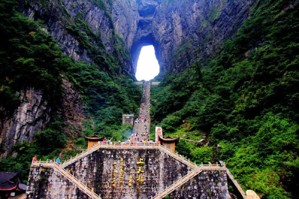 ▲ Tianmen Cave is the centerpiece attraction of Tianmen Mountain National Forest Park and one of the world's highest-altitude natural mountain-piercing caves. Perched on a sheer cliff over 1,260 meters above sea level, it towers more than 1,300 meters above the city below. The cave is famous for spectacular phenomena like "Tianmen's Misty Breath" and "Tianmen's Rosy Glow." When humidity is high before or after rain, rising vapors swirl like a giant white dragon through and around the cave, creating the breathtaking "Tianmen's Misty Breath" spectacle. On clear mornings or evenings, visitors might witness the rare "Tianmen's Rosy Glow" - a rainbow-hued light beam piercing through the cave opening.