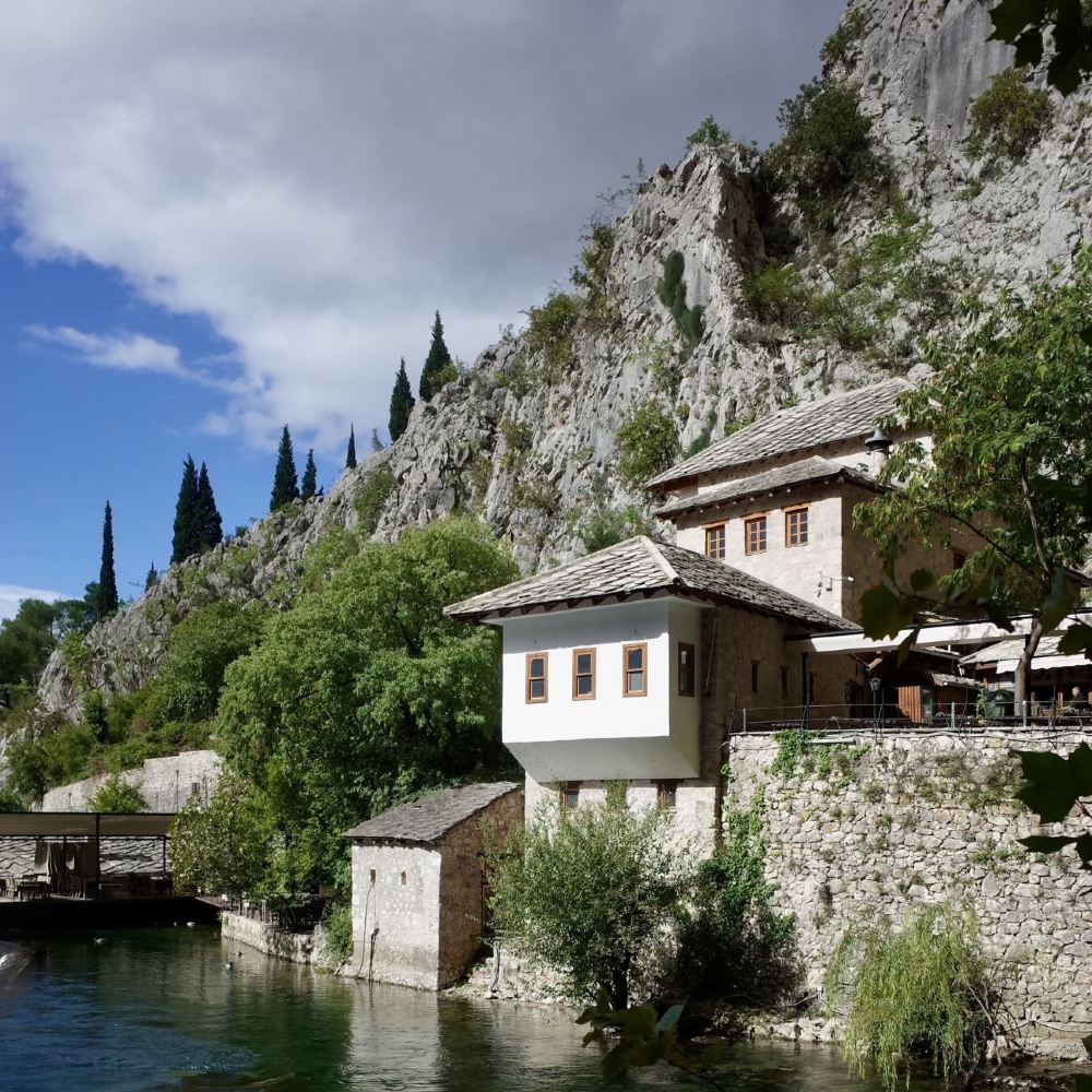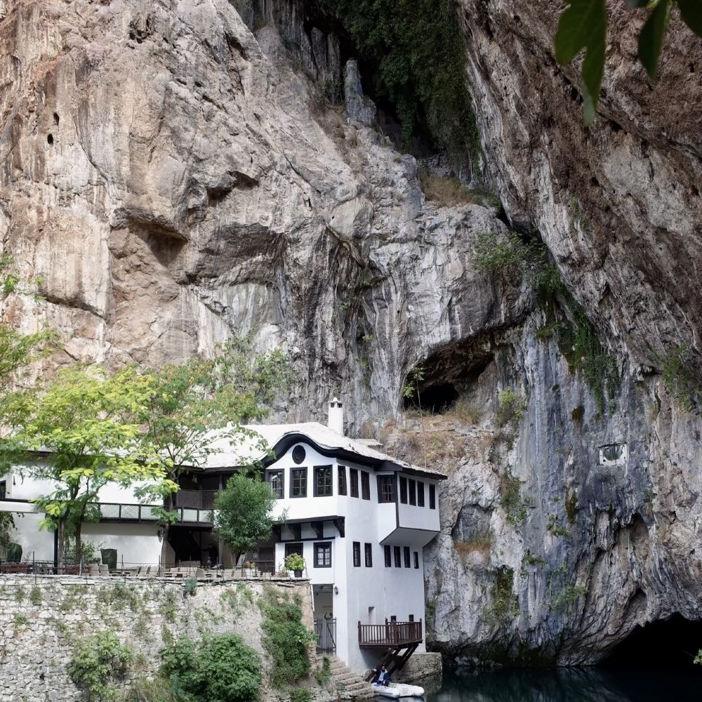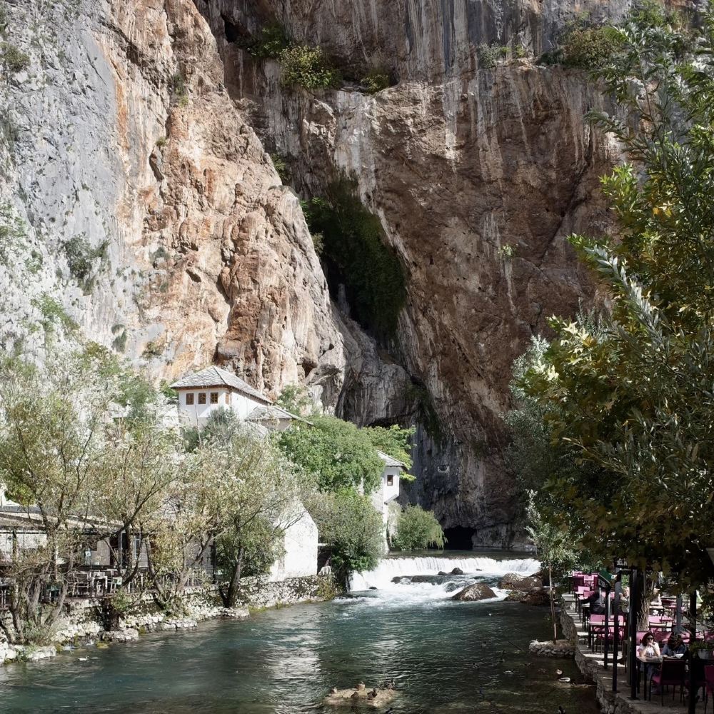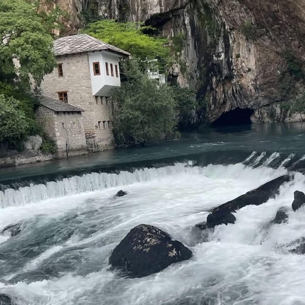 ▲ Blagaj Waterfall ◦ Map Name: Blagaj Waterfall ◦ Coordinates: Approximately 43.2778°N, 17.7583°E ◦ Description: Located in Blagaj, Bosnia and Herzegovina. The waterfall cascades down limestone cliffs into the Buna River, with crystal-clear waters and picturesque surroundings. Nearby stands a 16th-century Sufi monastery, built beneath the cliffs beside the spring, offering a serene and mystical atmosphere—an ideal place to experience both nature and religious ambiance.