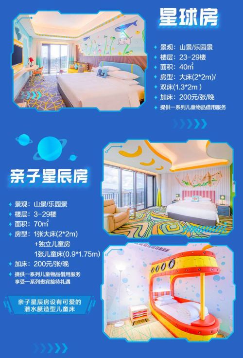 Rich family-friendly elements: A yellow submarine in the lobby center for children to explore, cartoon-patterned room amenities, and some rooms with balconies offering views of Chimelong Spaceship