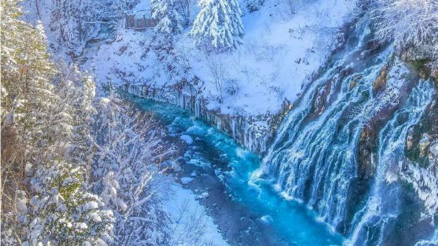 ▲ [Shirahige Waterfall] Shirahige Waterfall has a drop of 30 meters and is located at an elevation of 600 meters in the Shirogane Onsen area of Biei. It is named "Shirahige Waterfall" because the water cascading down through the rock crevices resembles white whiskers. The underground spring water strikes the rocks, creating waves with a shimmering blue glow.