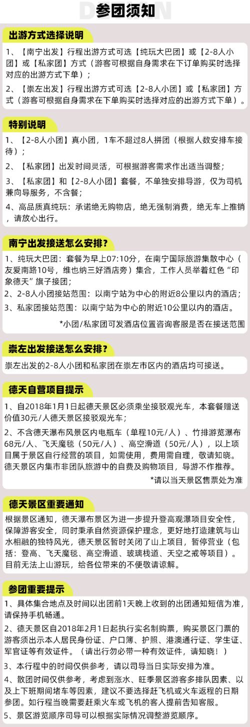 1. The "Private Independent Group" package provides door-to-door transfer service within Nanning city area: east to Langdong Bus Station, west to Xixiangtang Bus Station, south to Jiangnan Bus Station, and north to Anji Bus Station. If your location is outside the designated area, door-to-door pickup service will not be available. For locations beyond the service area, please follow the driver's actual instructions and wait at the nearest meeting point. Some hotels may not allow direct pickup at the entrance, and the exact boarding location will be confirmed by the driver.