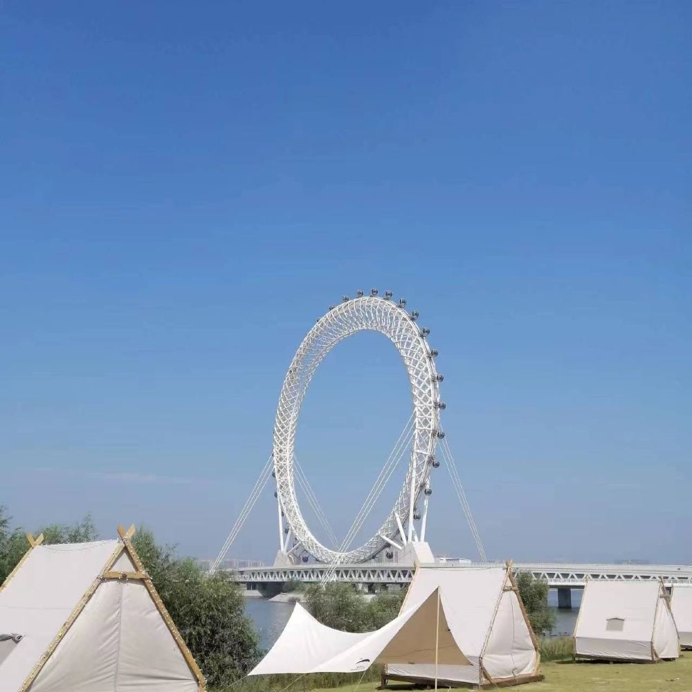 The "Eye of Bohai" Ferris wheel, located in the Binhai Technology Development Zone of Weifang City, Shandong Province, has been certified by Guinness World Records as the world's tallest axle-less Ferris wheel. The structure consists of an outer support truss frame built with 4,600 tons of steel beams over two years. Unlike traditional Ferris wheels with central axles, the Eye of Bohai operates without any central support - its wheel rim remains stationary while 36 suspended observation cabins (each accommodating 10 passengers) move along tracks via self-propelled mechanisms. A full rotation takes 30 minutes, allowing visitors to enjoy panoramic views of the Bailang River when reaching the maximum height of 145 meters.