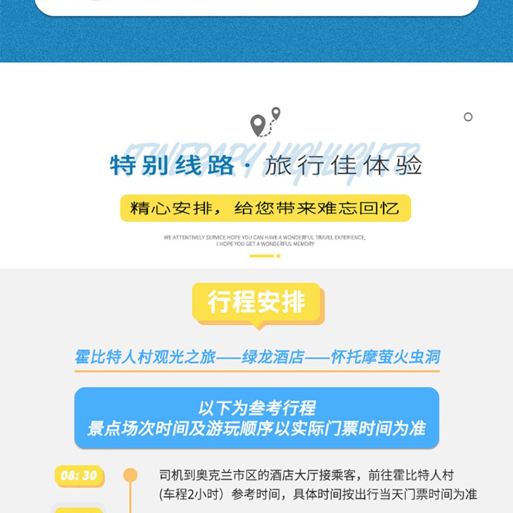 5. The itinerary prioritizes Route A (visiting Hobbiton first, then Waitomo Glowworm Caves). If attraction admission tickets are limited or timing constraints prevent visiting attractions as planned, the system will automatically switch to Route B (visiting Waitomo Glowworm Caves first, then Hobbiton). Except for the visiting order and dining locations, the attractions and routes for both A and B options remain identical.