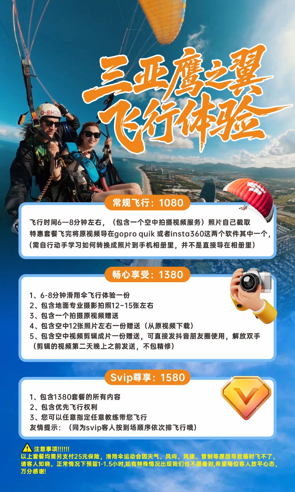 4. High heels and slippers are prohibited during the flight experience. Please wear outdoor shoes or casual sneakers.