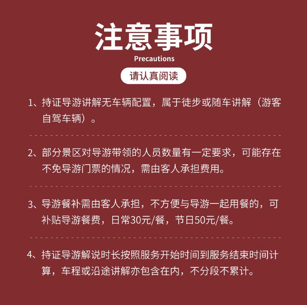 This product allows for self-service ordering. After booking, a guide will be arranged to contact you. The guide will provide a package tour with commentary. If you exceed the scheduled time on the day, you can pay an additional fee to extend the guided tour duration (50 yuan per hour).
