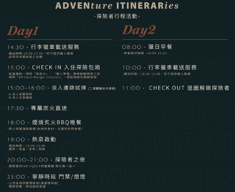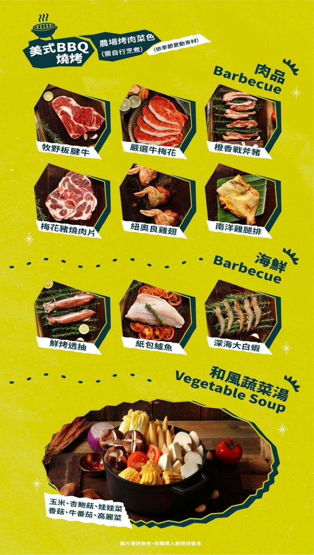 - Wildfire hunting land and sea package (includes BBQ ingredients and chef's specialty cooked dishes). If you need to cook hot pot, please bring your own equipment.