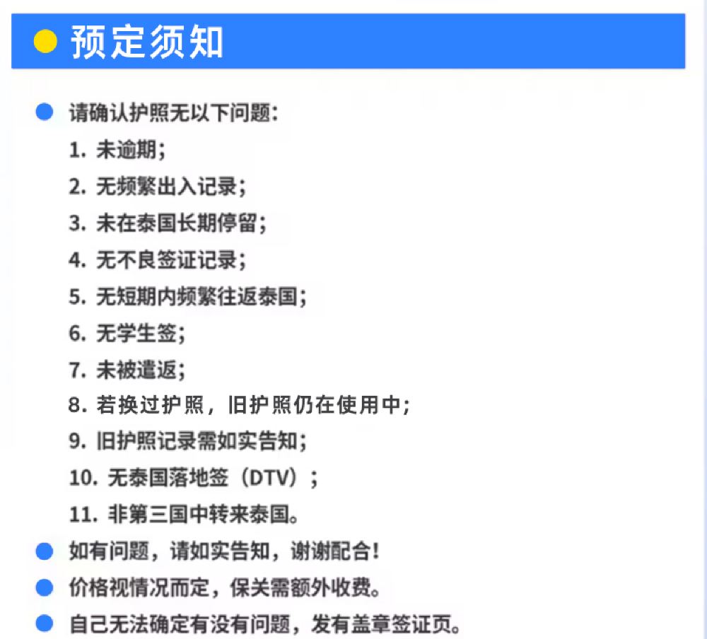 2. The passport must have no negative records. If there are any, please inform us in advance, as the cost for customs guarantee will differ (e.g., previously holding a Thai Buddhist study visa, volunteer visa, over 2 extensions of pandemic visas, single stay exceeding one month, multiple round-trip entries within one year, detention, visa denied, deportation, re-entry permits, or overstays - all count as negative records).