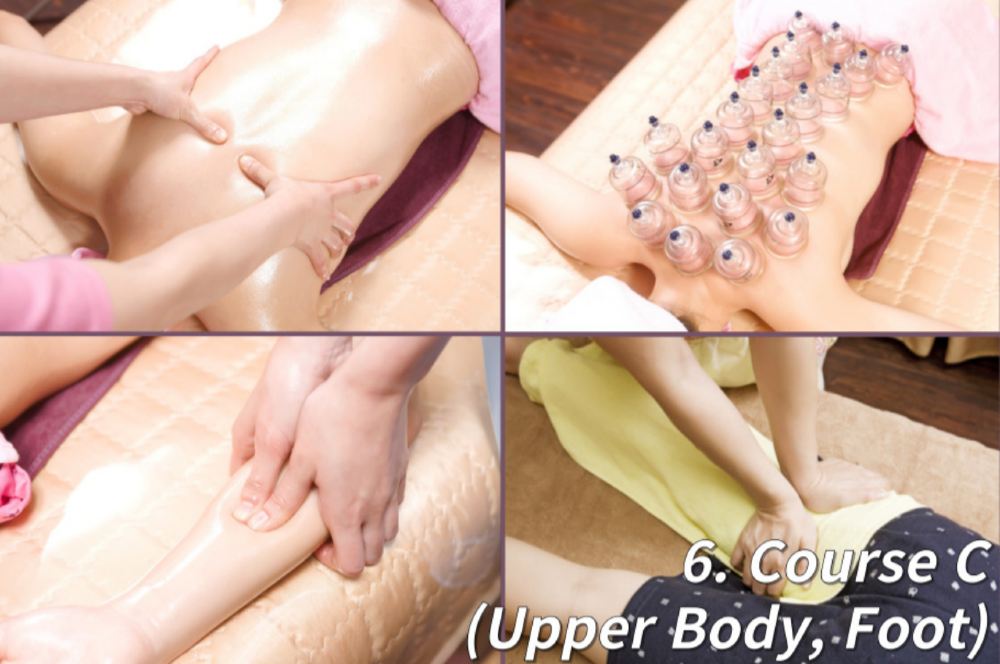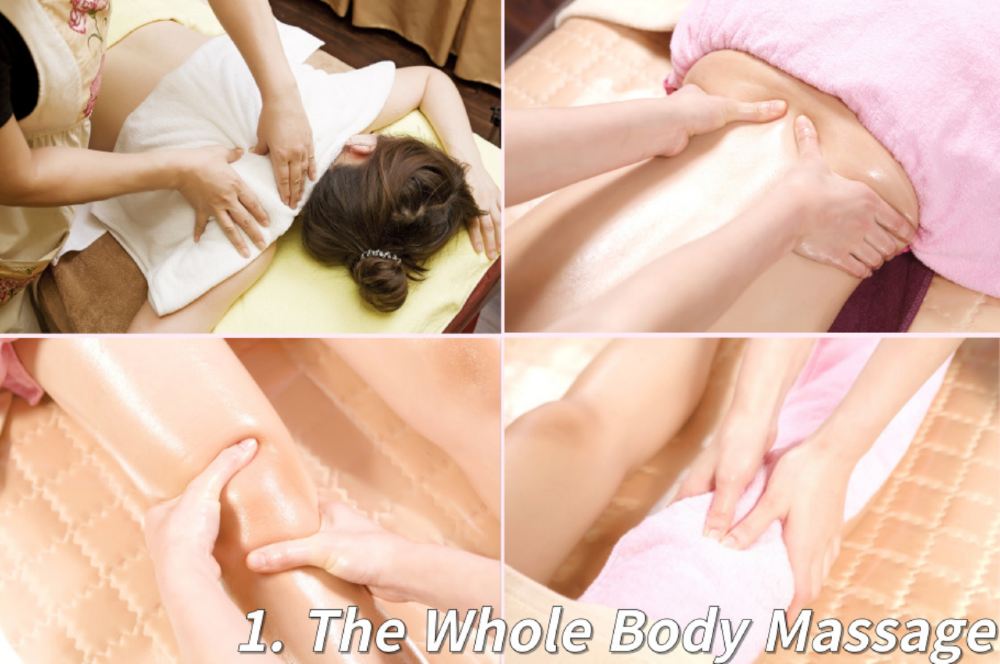 Facial massage - Full body massage (Aromatherapy oil + Meridian massage) - Abdominal massage - Foot massage - Head massage