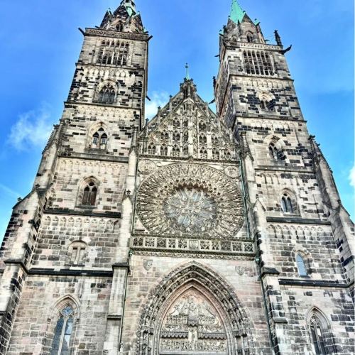 ▲ St. Lorenz stands tall and majestic, with its twin towers piercing the sky and their tops tinged with green. The exterior walls are built with stones of varying shades, exuding an ancient and solemn charm. The magnificent rose window is exquisitely crafted, while the intricate carvings on the porch showcase superb artistry. Crowds bustle at the entrance, and against the backdrop of the blue sky, the Gothic architecture appears even more grand and awe-inspiring, radiating a solemn religious atmosphere.