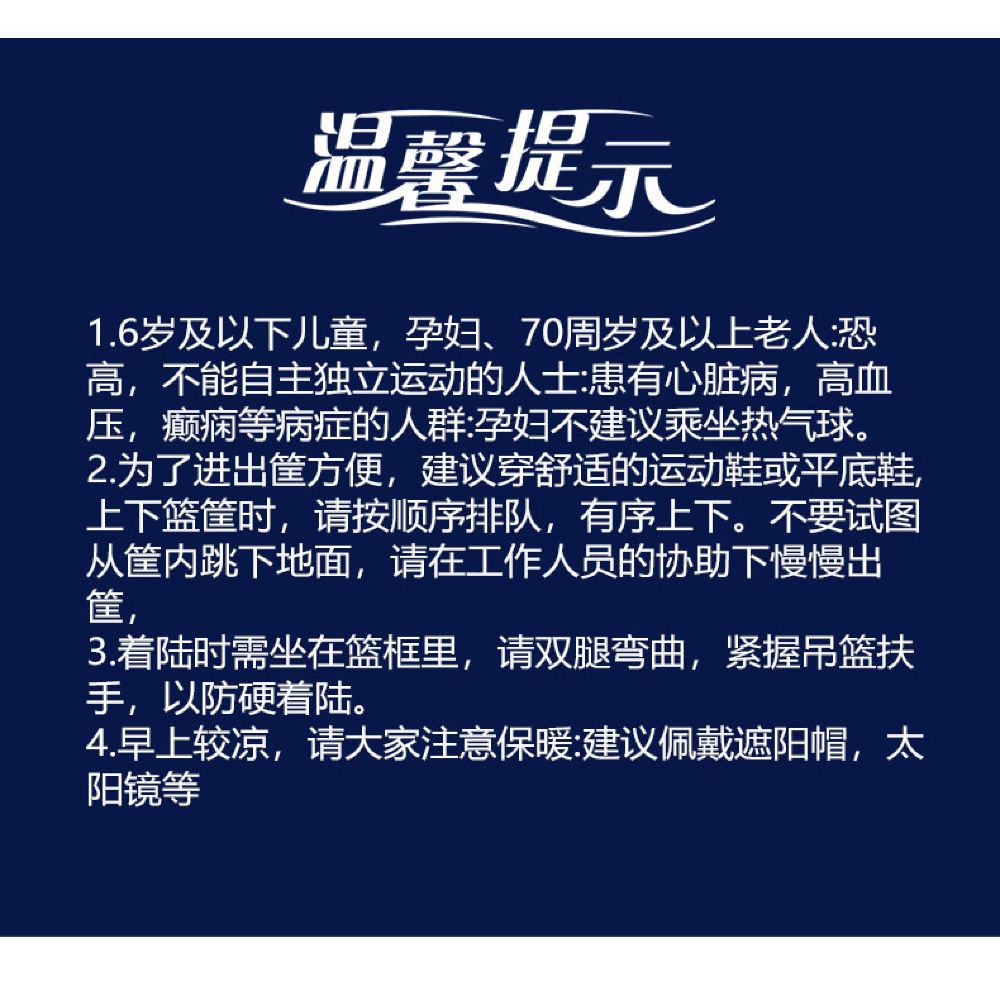 3. Except for normal flight cancellations by the hot air balloon company, all compensation terms shall be executed in accordance with this product's compensation policy. Refund or compensation requests due to any personal reasons from customers will not be accepted. Please place your order if you agree to these terms.