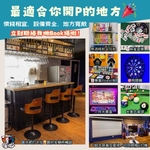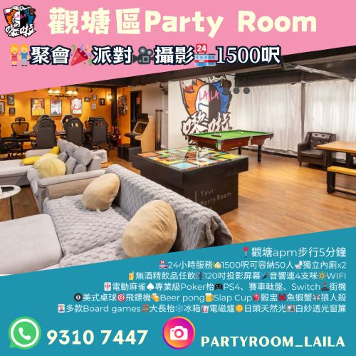 The Kwun Tong Lai La Party Room boasts a variety of recreational facilities and spans 1,500 square feet, making it ideal for gatherings with family and friends, birthday parties, company events, fan meetings, and social events. It can accommodate up to 40 people for private events and offers a wide selection of non-alcoholic beverages. Various scenes and lighting equipment are also available for filming; many media outlets and online platforms have rented the room for celebrity interviews and video shoots. The party room is conveniently located near the apm shopping mall, just a 5-minute walk away.