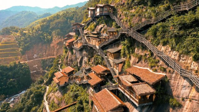 ▲ Wooden houses are scattered in a staggered arrangement, cascading down the valley.