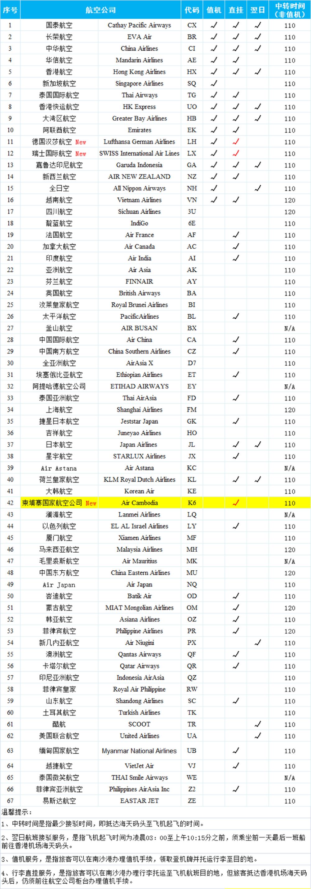 The list of airlines providing this service is subject to change. For the latest information, please check the Hong Kong Airport website:
