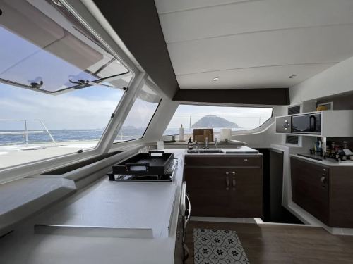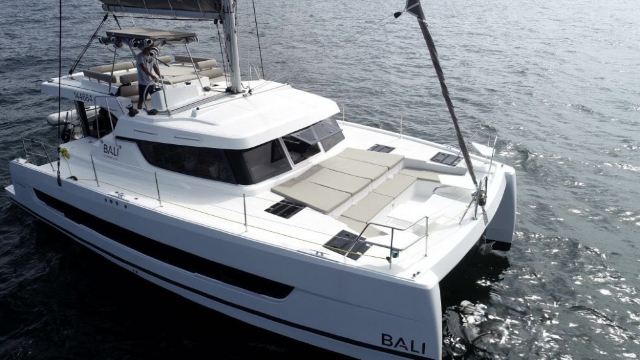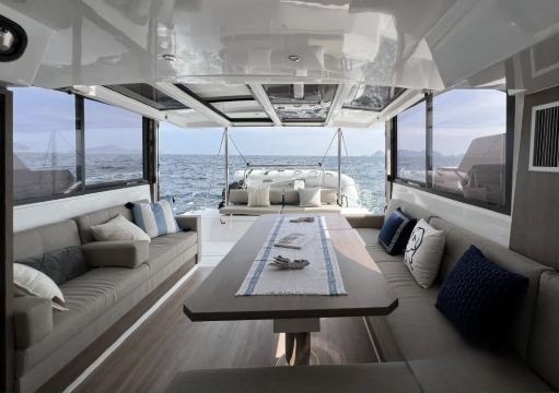 Conceived by Olivier Poncin, the new BALI Catspace luxury sailing boat combines innovative features for cruising. The full deck design enhances sailing efficiency, allowing seamless movement between different spaces, from the aft platform with bench seating to the forward cockpit featuring a lounge area and sunbathing zone.